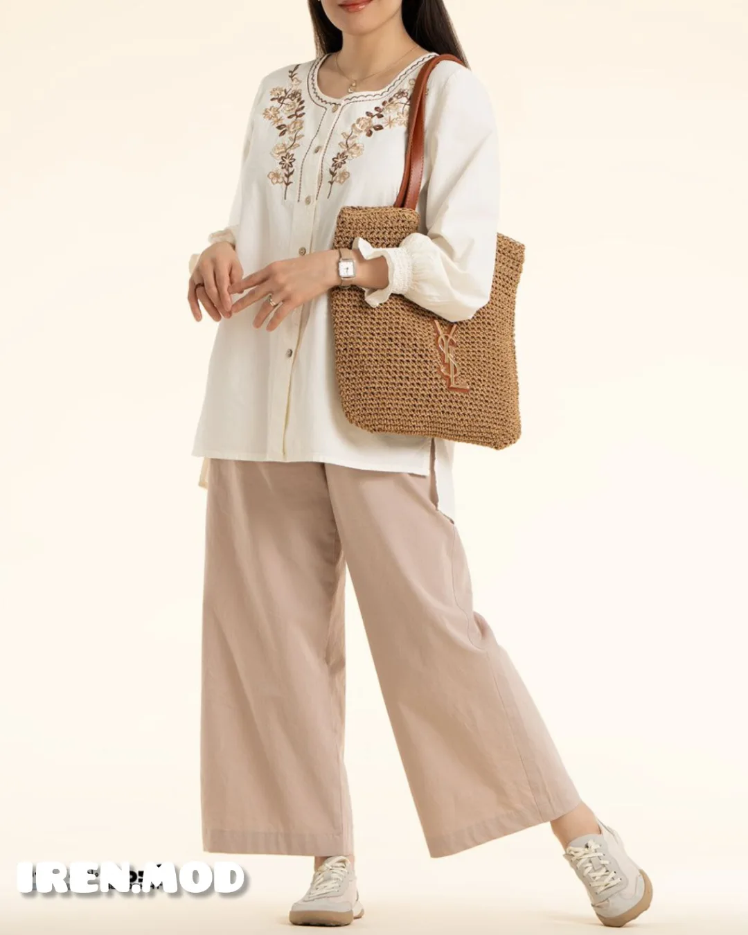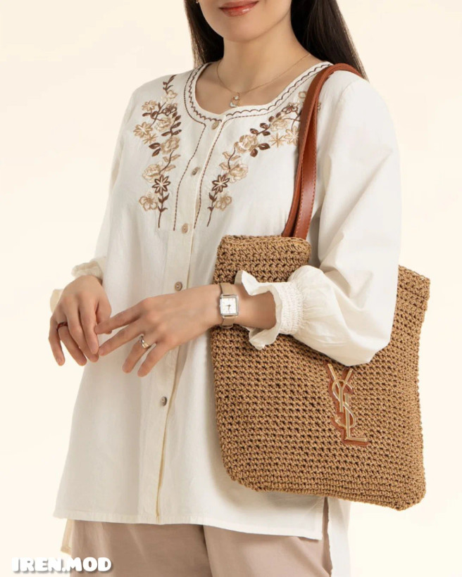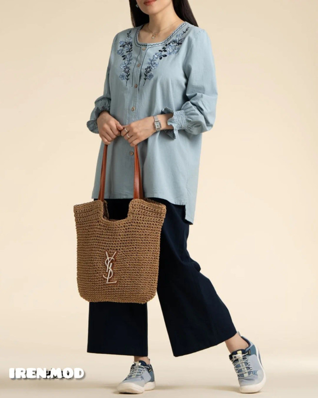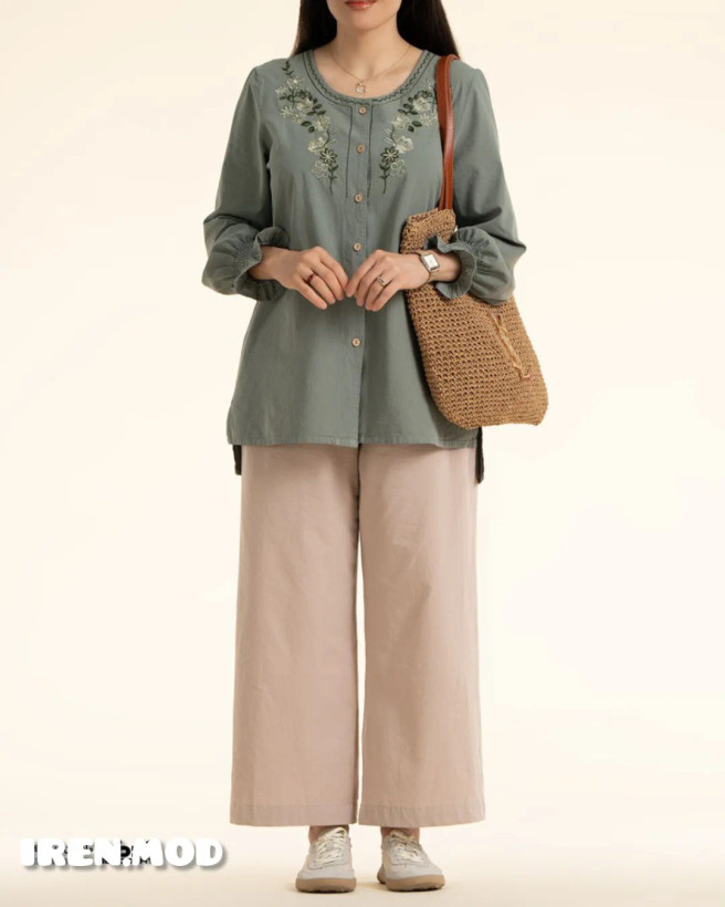 شومیز ماهوین دارای جنس پارچه الیاف طبیعی پنبه با گلدوزی. قد ~77 و قد آستین ~58. دورسینه و دورباسن متغیر براساس سایز.