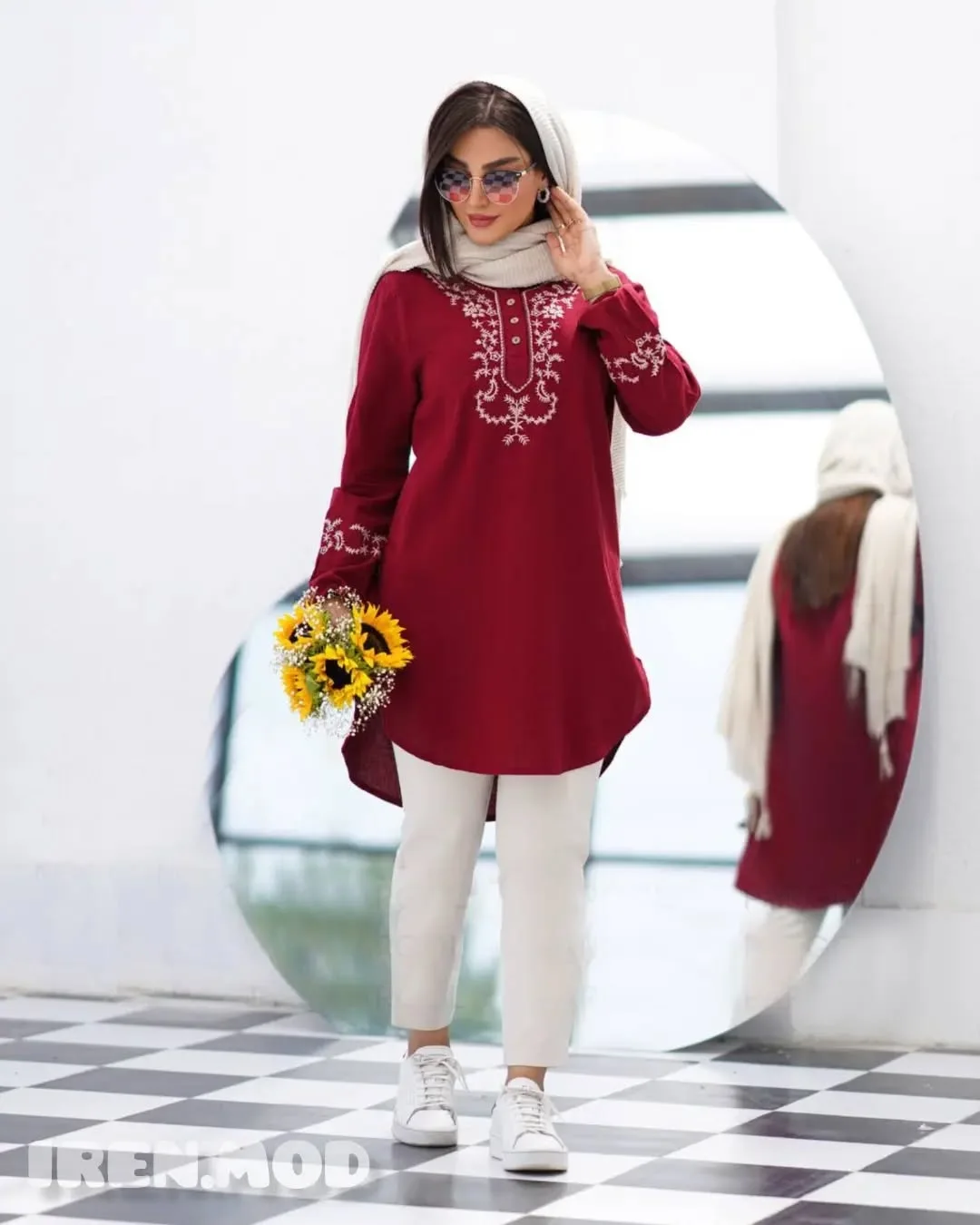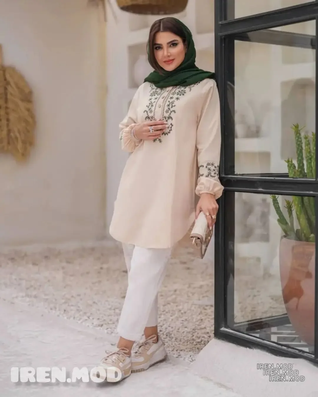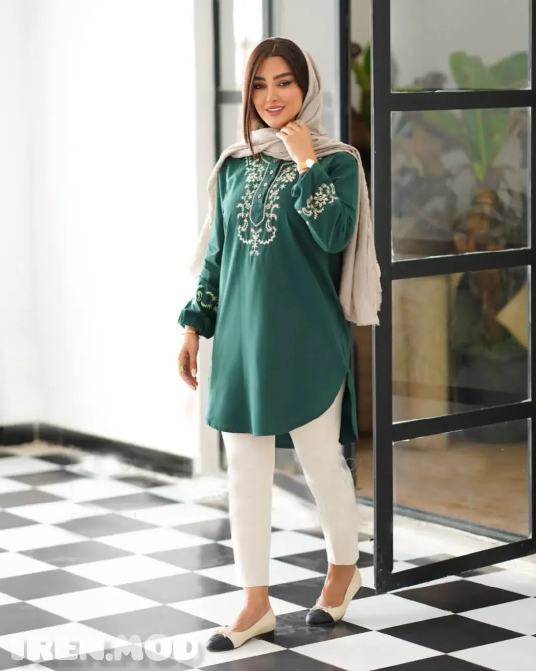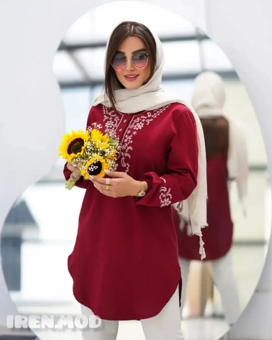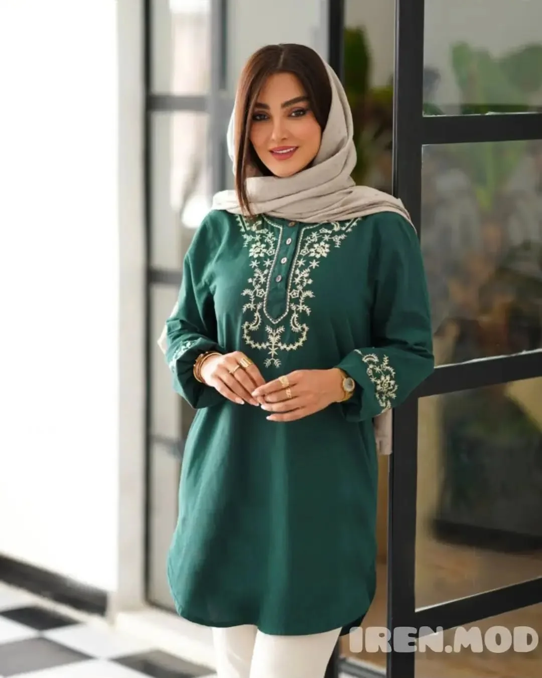 تونیک آستین کش میخورد کاملاً گلدوزی شده دکمه تونیک باز میشود جنس نخ پنه درجه یک